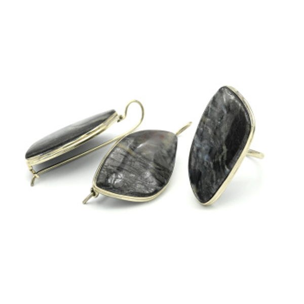 Кольцо c гематитом, литое широкое, цвет родиум, се..