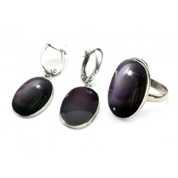 Кольцо и серьги обсидиан снежный овал 10х8мм..