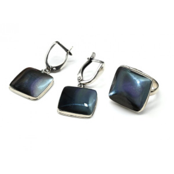 Кольцо и серьги обсидиан снежный овал 10х8мм..