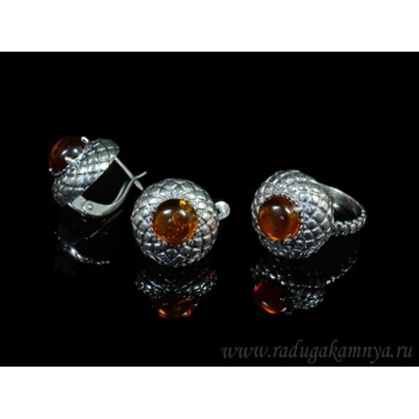 Комплект с янтарём в посеребрении кольцо, серьги к..