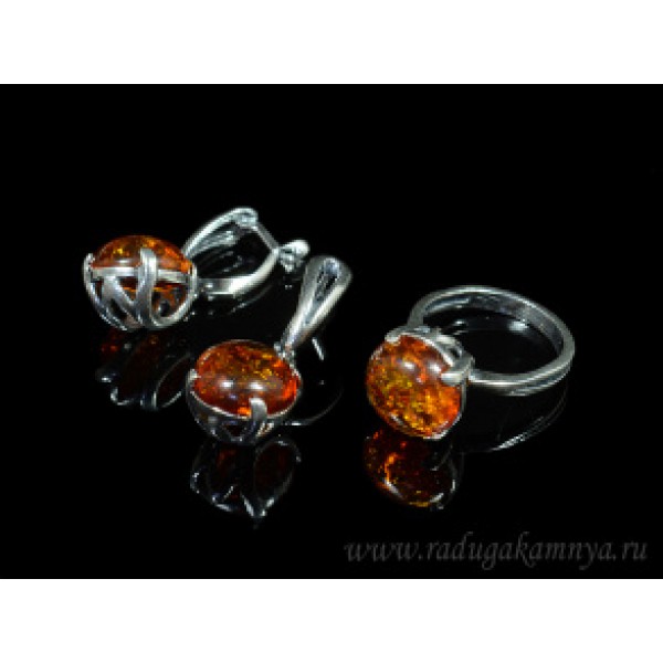 Комплект с янтарём в посеребрении кольцо, серьги к..