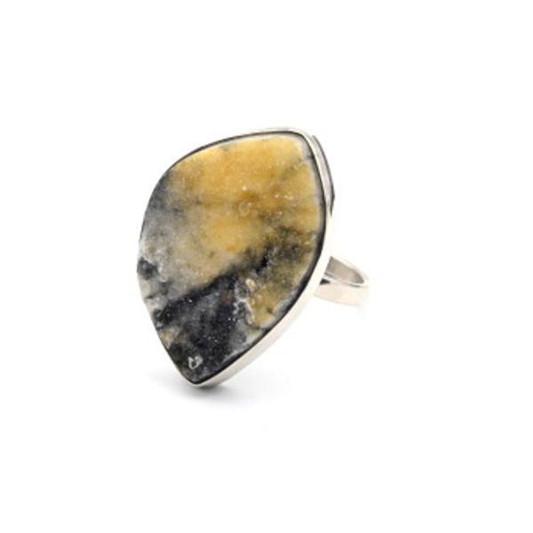 Брошь из халцедона полосатого, цвет желтый, с ажурным контуром,  цвет ант. серебро, овал 25х18мм