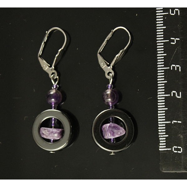 Серьги чароит (галтовка), аметист (шарик 6мм), гематит (круг)