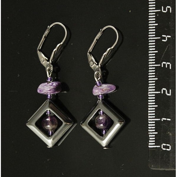 Серьги чароит (галтовка), аметист (шарик 6мм), гематит (ромб)