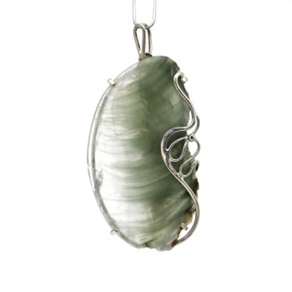 Брошь из кошачьего глаза (иск., серебристый) "вензель", основа 70х2.4мм, овал 18х13мм, подвеска яшма далматиновая