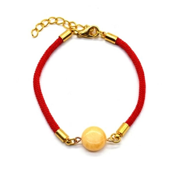 Красная нить на запястье со вставкой из янтаря круг 12мм цвет молочный, золотистый, 18см (иск.)