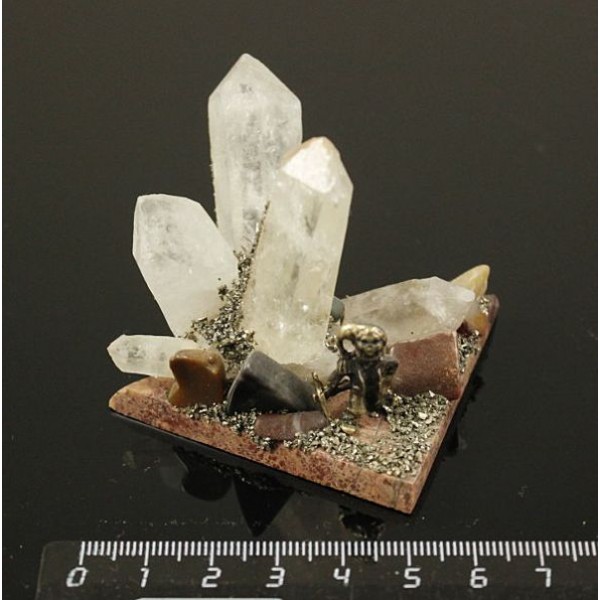 Сувенир 7х6х6см из кристаллов горного хрусталя на яшме уральской, с фигуркой мастера