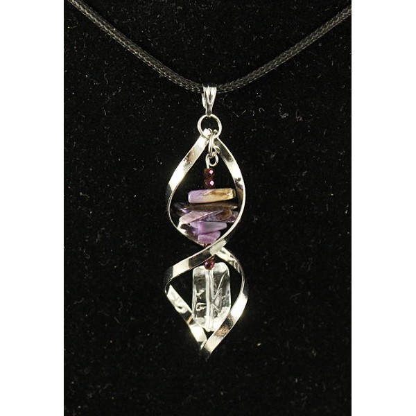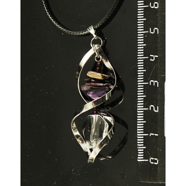 Кулон в спирали чароит (галтовка мелкая), горный хрусталь (крупная огранка), гематит (шарик 2мм огранка)
