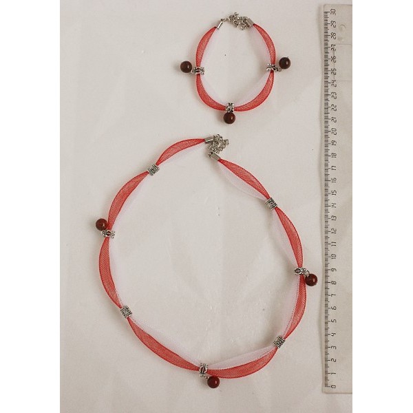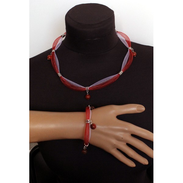 Комплект: колье и браслет из яшмы красной на сетке, цвет красный и белый, шарик 10мм