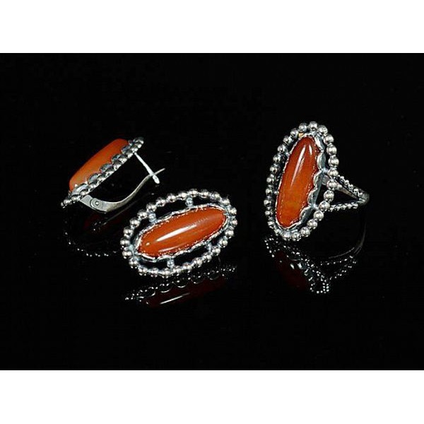 Комплект: кольцо и серьги из сердолика, овал, мельхиор