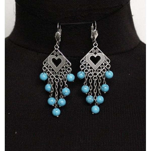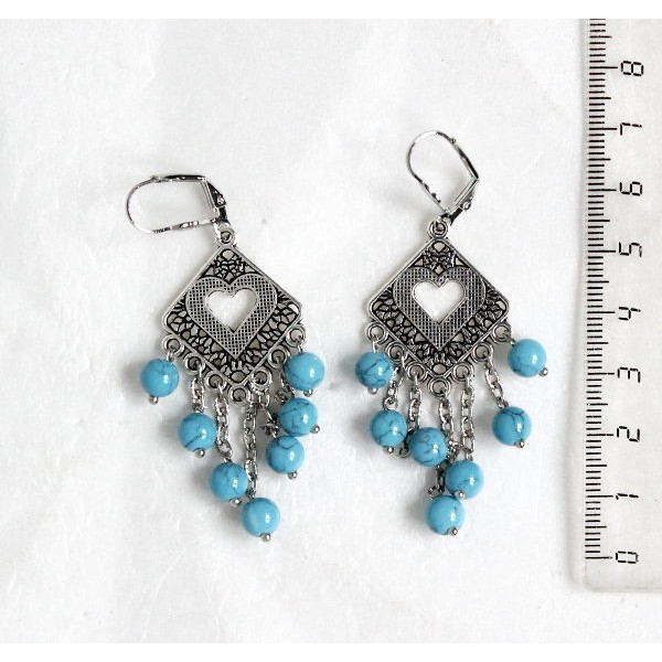 Cерьги из бирюзы (имитация), шарик 6мм, коннектор "сердце в ромбе" + цепочка