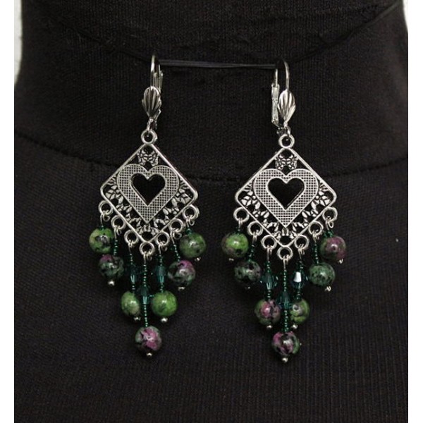 Cерьги из цоизита (шарик 6мм), коннектор "сердце в ромбе" + хрусталь