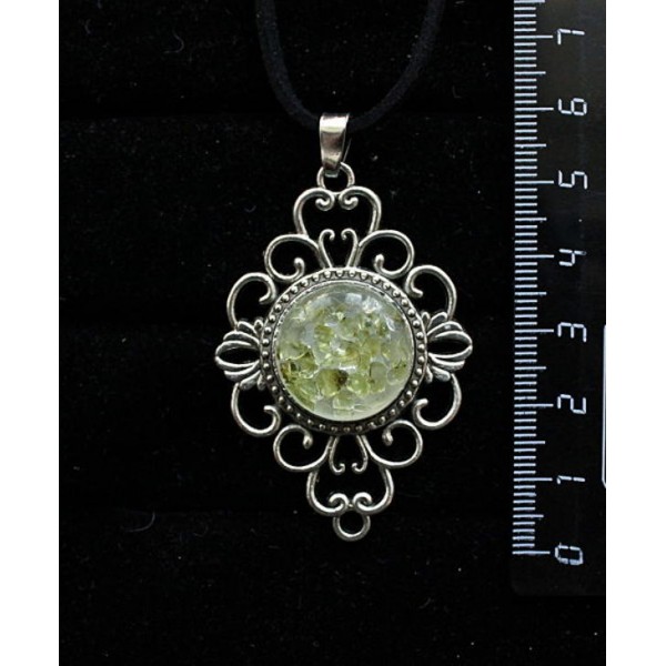 Кулон из хризолита (кабошон-мозаика), круг 18мм, оправа "ромб с узором"