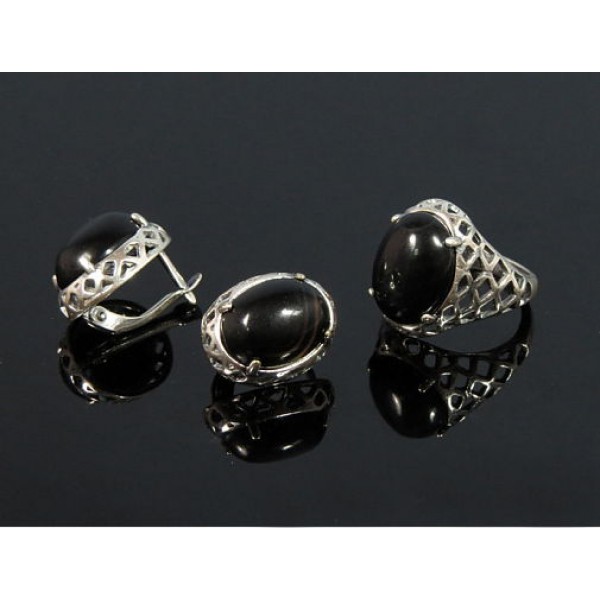 Кольцо и серьги с агатом черным