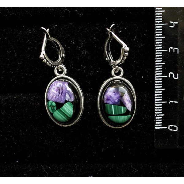Cерьги из чароита с малахитом (кабошон-мозаика), овал 18х13мм, оправа "трилистник", швензы посеребрение