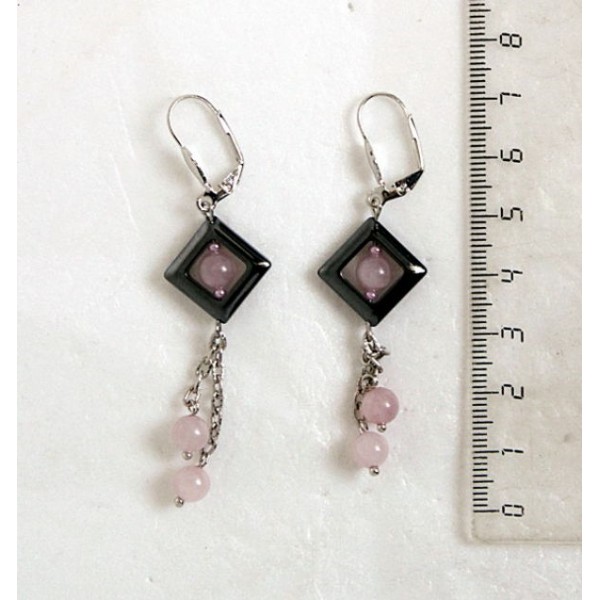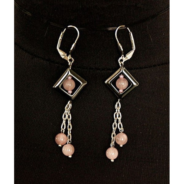 Серьги из розового кварца, шарики 6мм в квадратной рамке из гематита и на цепочке
