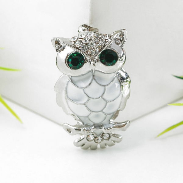 Брошь "Сова", цвет зелёно-белый, цвет серебристый (стразы, эмаль)