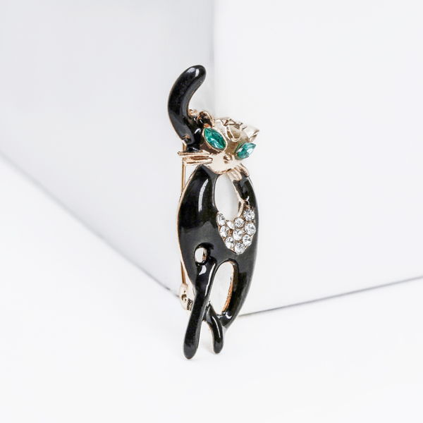 Брошь "Кошка" грация, цвет черно-белый, цвет золотистый (стразы, эмаль, бижутерный сплав)