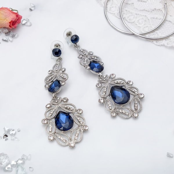 Серьги висячие со стразами "Грация" резная, цвет синий, цвет серебристый (Стекло, стразы, бижутерный сплав)