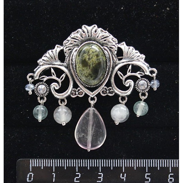 Брошь из змеевика "трюмо", овал 18х13мм, со стразами и подвесками из флюорита