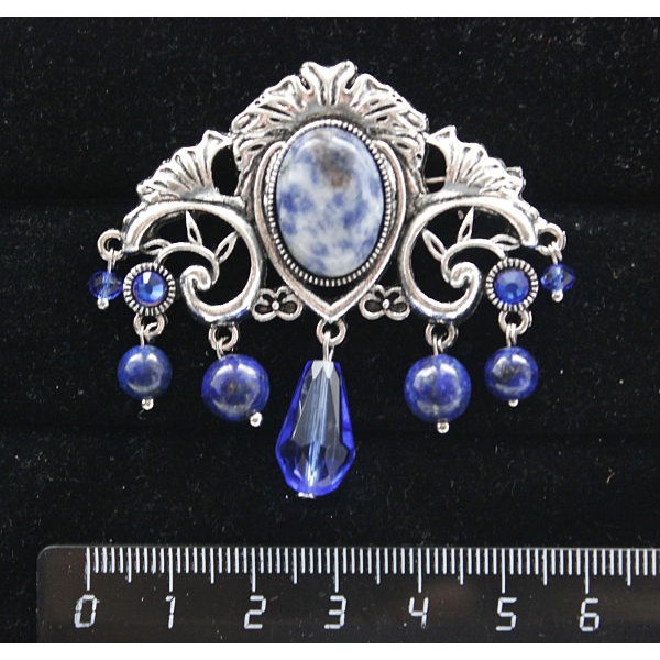 Брошь из содалита "трюмо", овал 18х13мм, со стразами и подвесками из хрусталя и лазурита