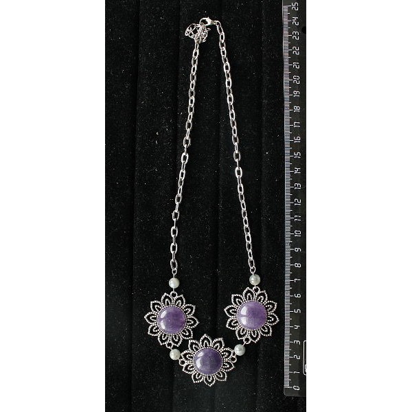 Колье из гелиотиса (иск.) и кварца тонированного, цвет аметист, "3 цветка" на цепочке, 48-50см, круг 18мм