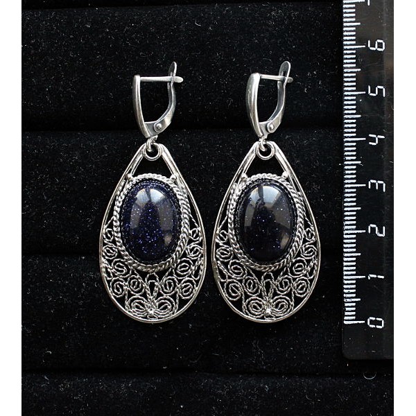 Серьги из авантюрина синего (имитация), филигрань, ручная работа, камень овал 18х13мм, швензы посеребрение