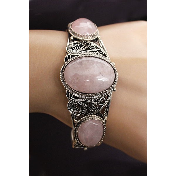 Браслет из розового кварца, филигрань, ручная работа, камень овал 25х18мм, овал 18х13мм