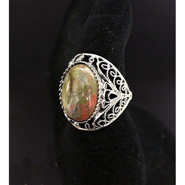 Кольцо из унакита, филигрань, ручная работа, камень овал 18х13мм