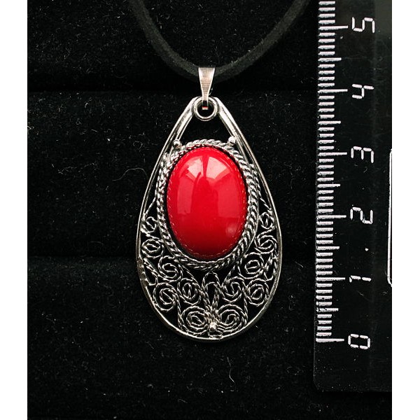 Кулон из коралла красного (иск.), овал 25х18мм, филигрань