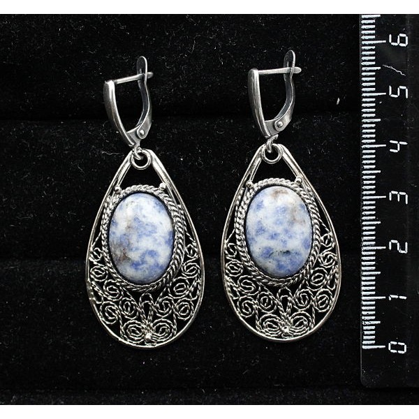 Серьги из лазурита бело-синего, филигрань, ручная работа, камень овал 18х13мм, швензы посеребрение
