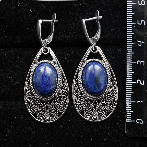 Серьги из лазурита ярко-синего, филигрань, ручная работа, камень овал 18х13мм, швензы посеребрение
