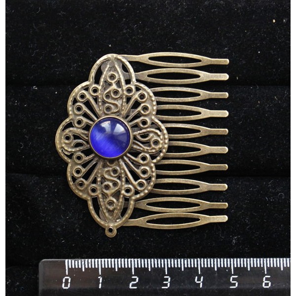Заколка-шпилька из кошачьего глаза (синт.), цвет синий индиго, круг 12мм, основа цвет бронза с узором