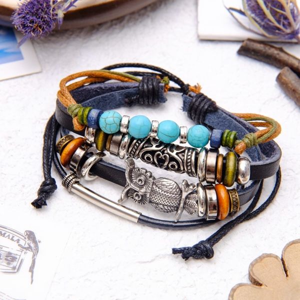 • Браслет кожа "Сова" и ряд бусин, цвет чёрный