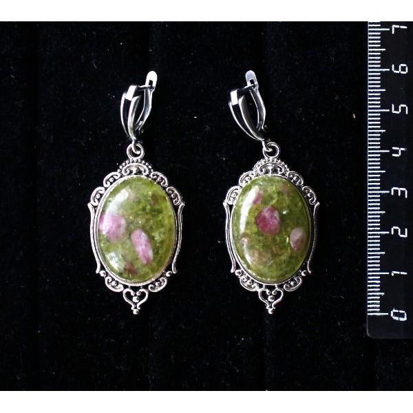 Серьги из змеевика, овал 25х18мм, оправа "медальон", швензы посеребрение