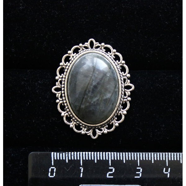Брошь из лабрадорита, с ажурным контуром, цвет ант. серебро, овал 25х18мм