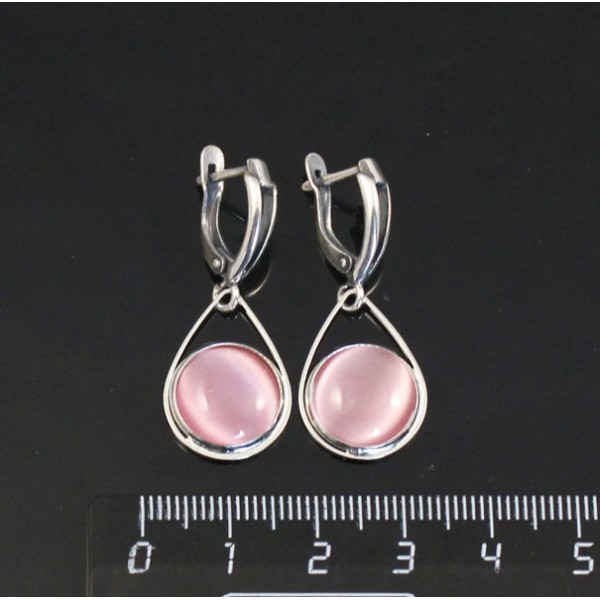 Серьги из кошачьего глаза (синт.), цвет розовый, круг 12мм, "капелька", швензы посеребрение