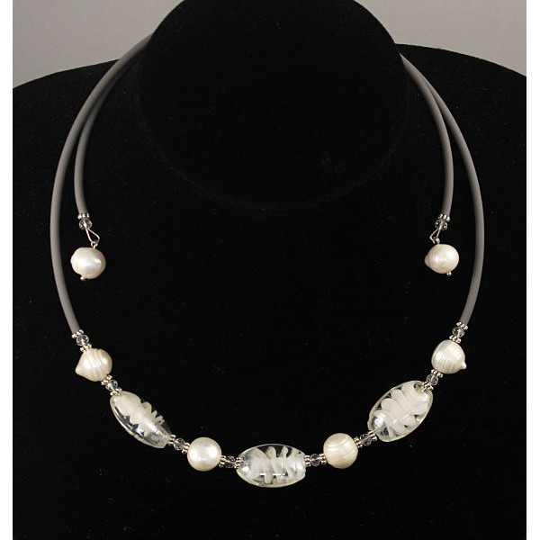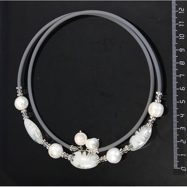 Колье на струнке из жемчуга белого и белого муранского стекла