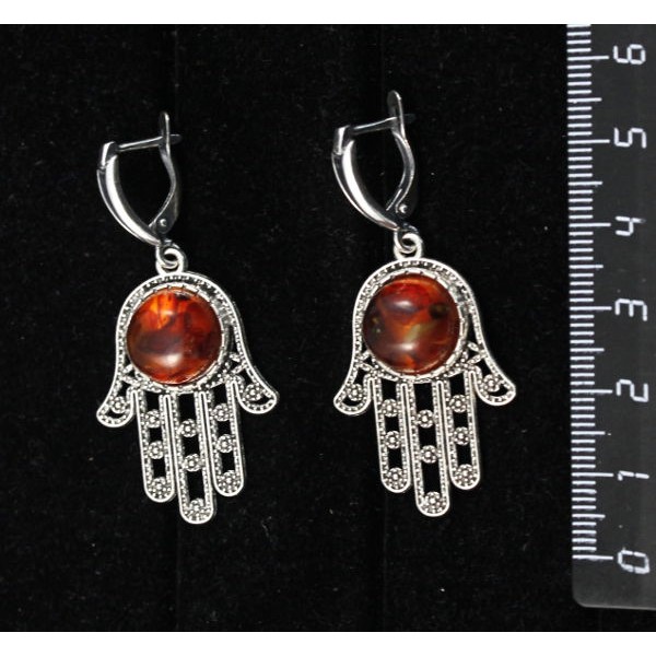 Серьги из янтаря темного, кабошон-мозаика, круг 12мм, "хамса", швензы посеребрение