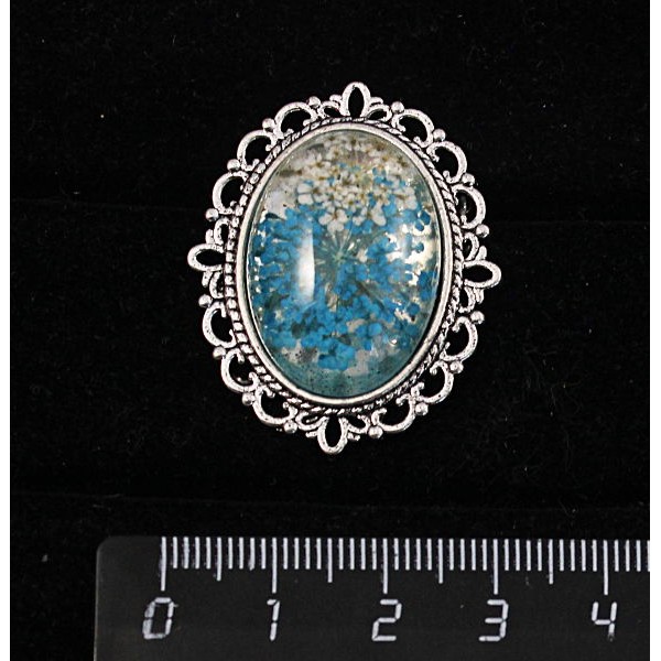Кольцо с кабошоном из пластика "два цветка", цвет морская волна,, овал 25х18мм, безразмерное (литая оправа)