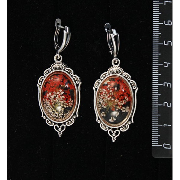 Серьги c кабошоном из пластика "два цветка", цвет красный, овал 25х18мм, оправа "медальон", швензы посеребрение