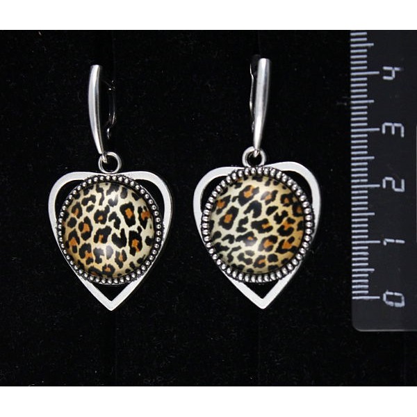 Серьги с кабошоном из пластика, рисунок леопард, "сердечко", круг 18мм, швензы посеребрение