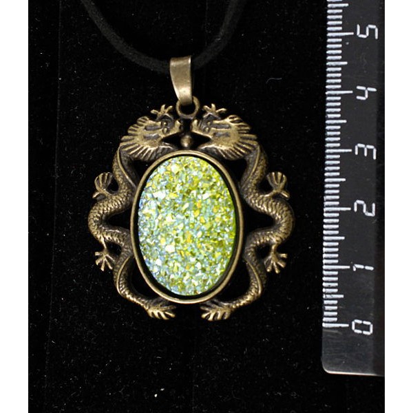 Кулон c кабошоном из пластика "щетка кристаллов", цвет салатовый, овал 25х18мм, цвет бронза "2 дракона"
