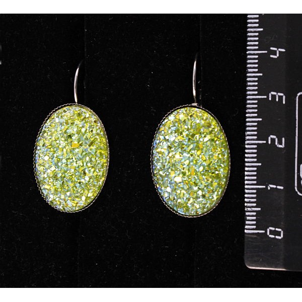 Серьги c кабошоном из пластика "щетка кристаллов", цвет салатовый, простой овал 25х18мм, швензы посеребрение