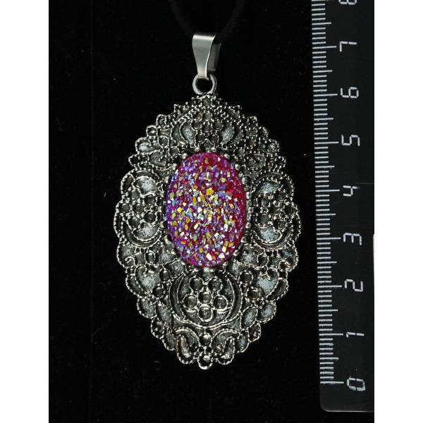Кулон c кабошоном из пластика "щетка кристаллов", цвет малиновый, овал 25х18мм, филигрань