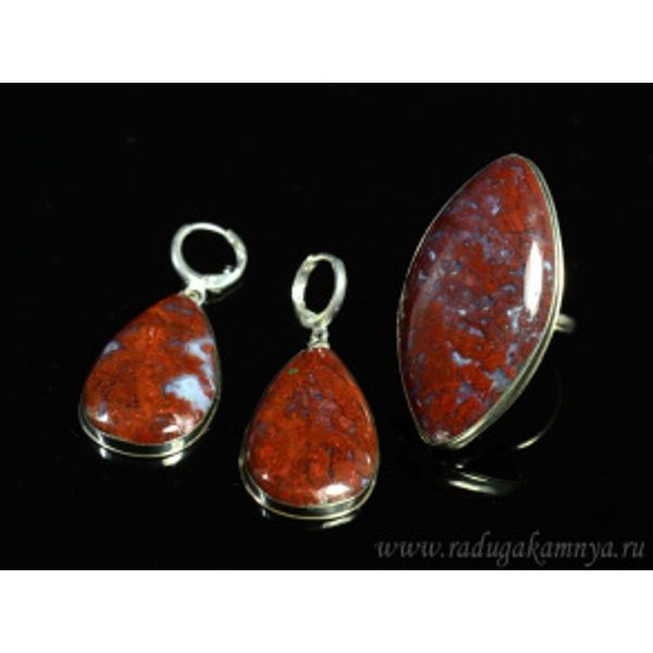 Кольцо и серьги с агатом тонированным, цвет красн..
