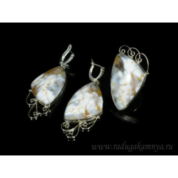 Кольцо и серьги из агата (срез жеоды), капля 38х18..