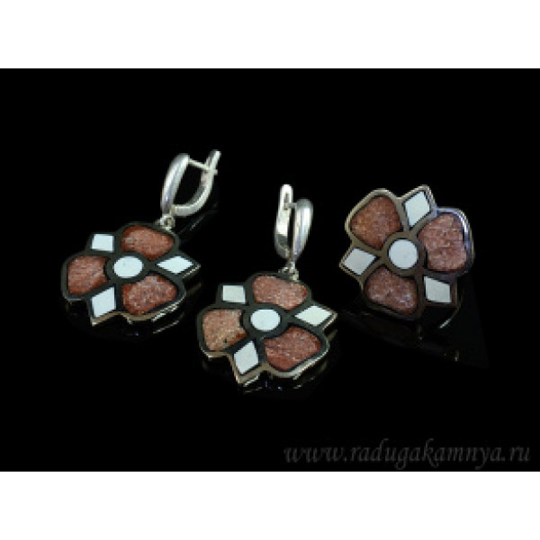 Кольцо и серьги с агатом тиманским и кахолонгом"Бабочка"