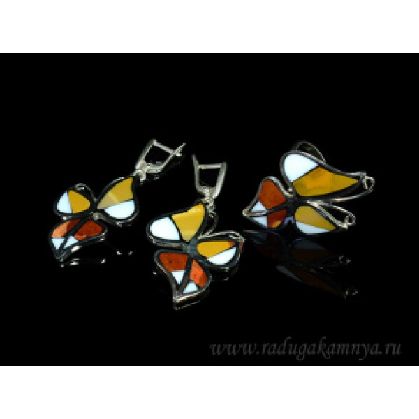 Кольцо и серьги мозаика "Бабочки" с яшмой и кахолонгом
