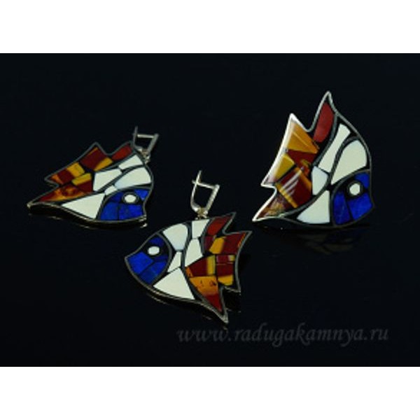 Кольцо и серьги "Рыбки" яшма мукаит, кахолонг и лазурит 36*46мм.